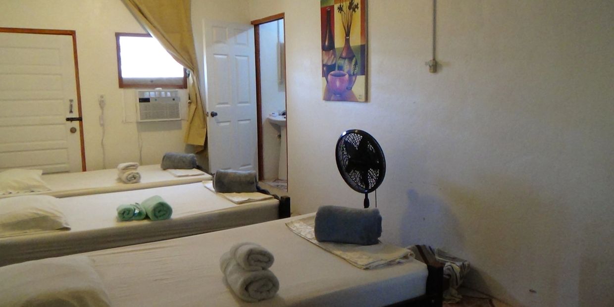 Air-conditioned bedroom and private bath for up to three persons in single beds. Tiled floor, corner table, chairs and lamp complete the bedroom, which has immediate access to covered verandah. Free parking in fenced compound is included. Property is near supermarkets, restaurants, bakery, fruit market and public transportation.